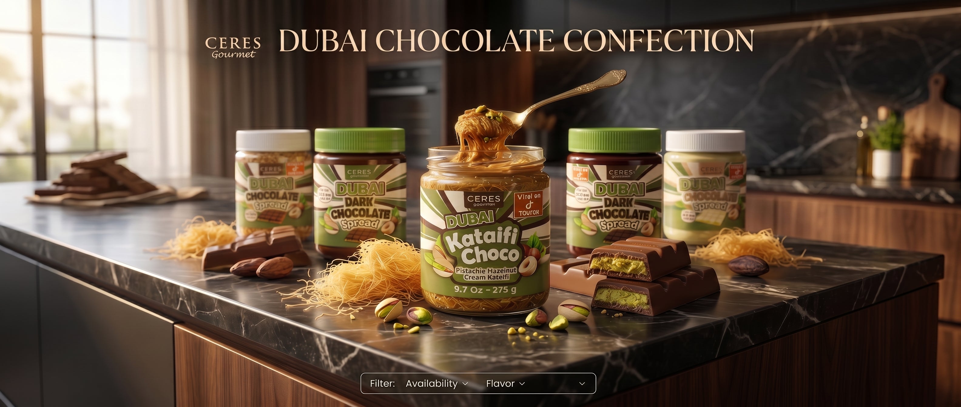 Ceres Gourmet is dedicated to crafting chocolates that celebrate global tastes and cultural diversity. This unique chocolate bar is inspired by Dubai—a city known for its luxurious lifestyle, cultural vibrancy, and love for innovative culinary creations. The fusion of kunafa, a traditional Middle Eastern pastry, with the nutty richness of pistachios and the decadence of chocolate, makes this bar a masterpiece of flavor and texture.
