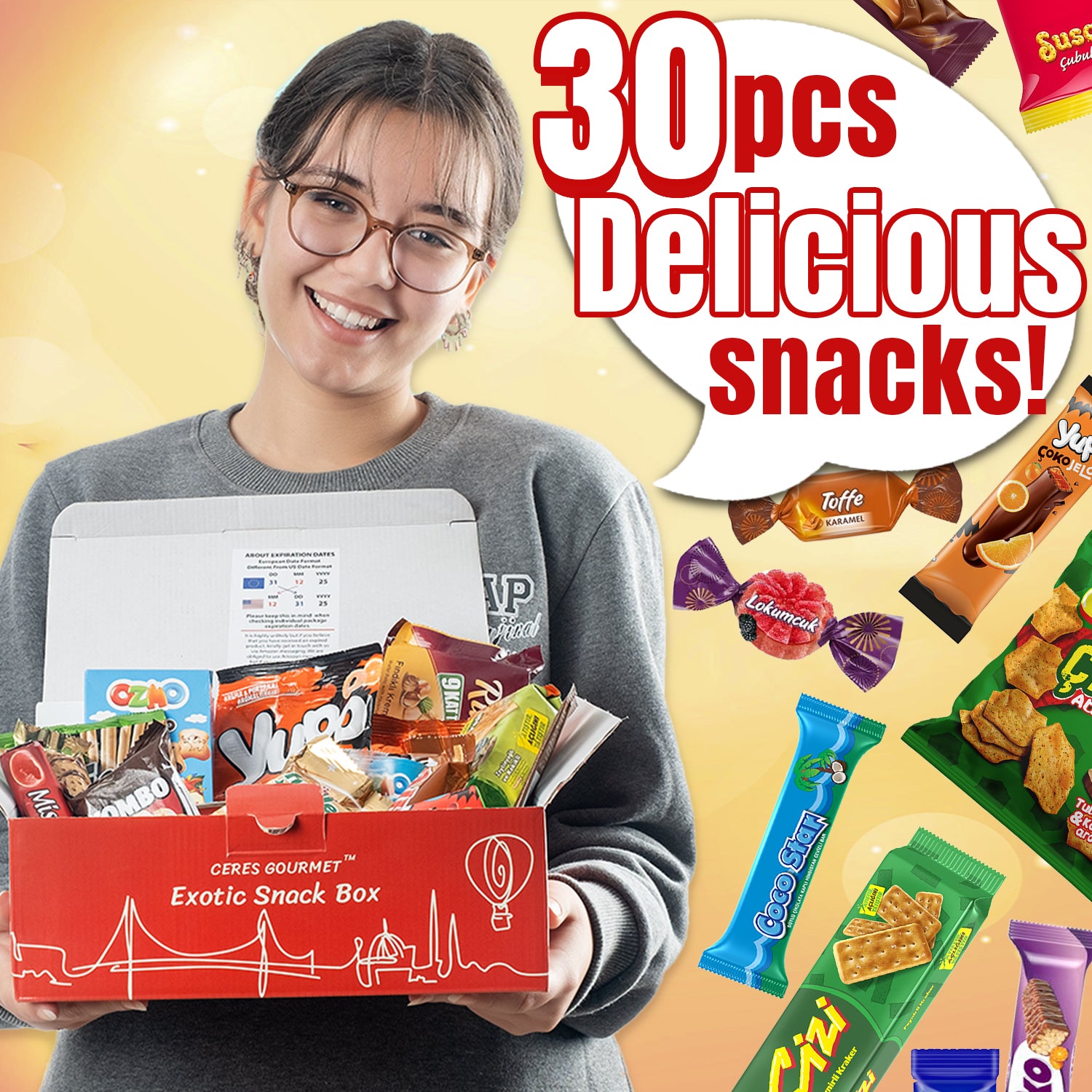 - 30 Assorted International Treats: Handpicked from around the world. Expect the unexpectedâAsian chips, European chocolates, Latin American candies, and more.