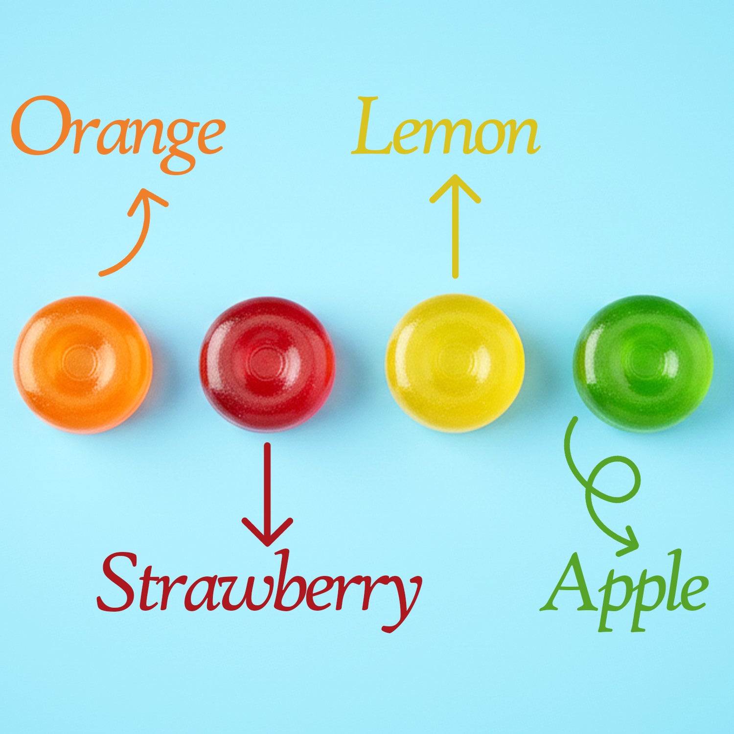 - Colorful mix of fruit flavors including lemon, orange, strawberry, and apple